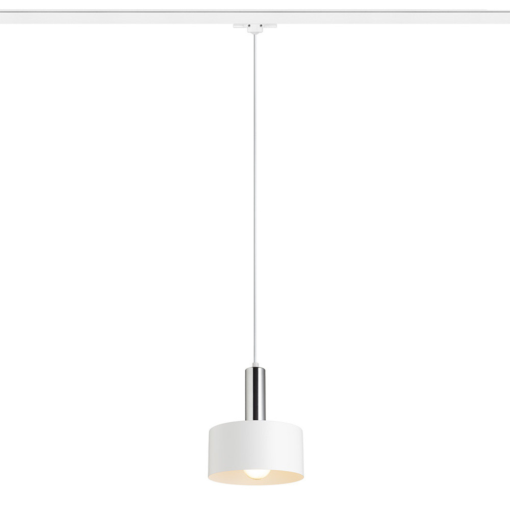 Pendant lamp with a lacquered metal shade and a textile cable. The cable can be connected to an adapter for three-circuit tracks.