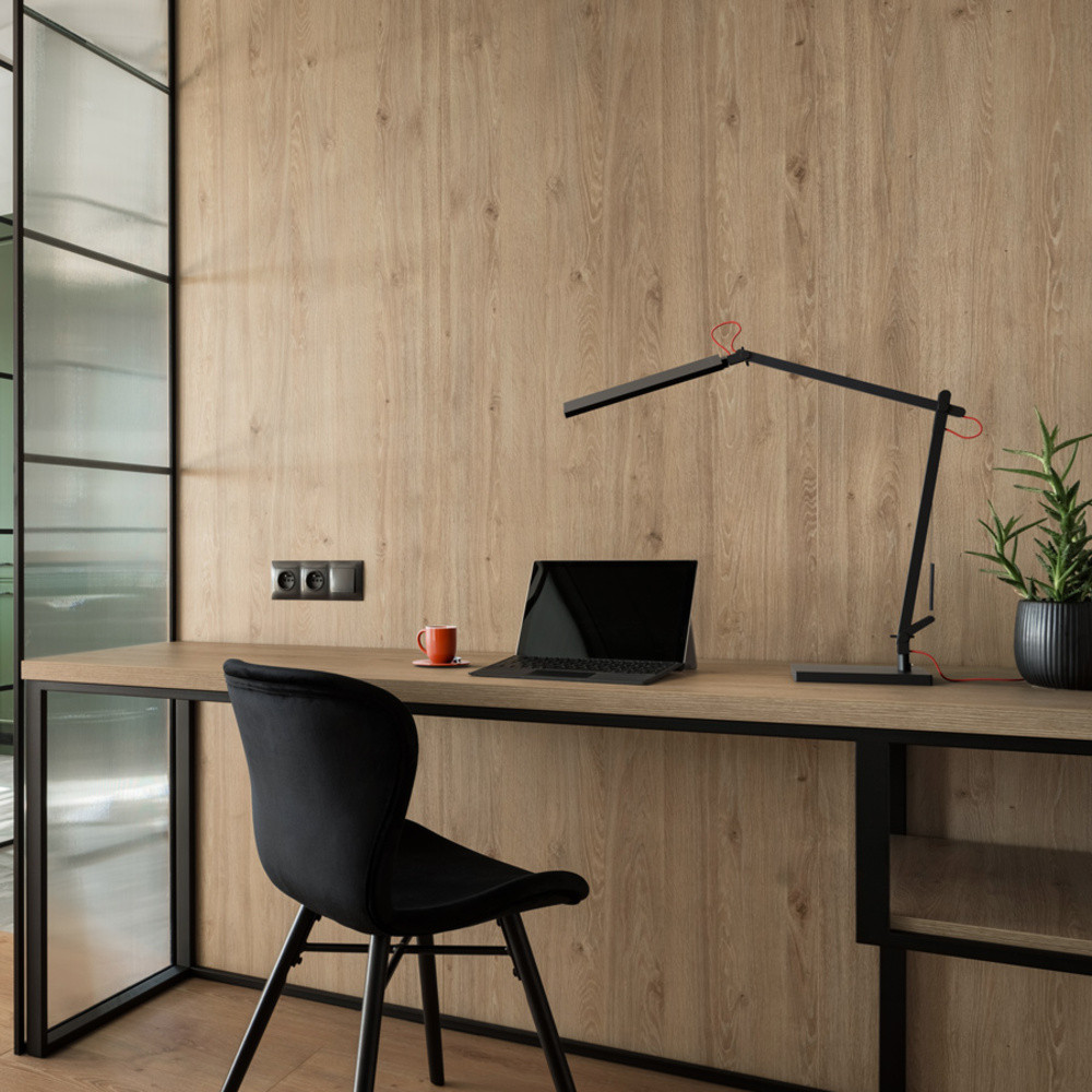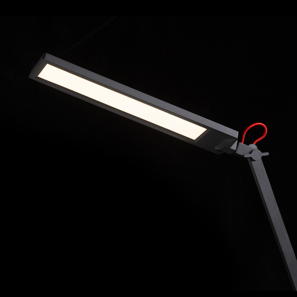 LED table lamp with two arms. Brightness and color control is located on the top of the reflector. Three-stage brightness control. The lamp can be mounted on a tabletop or shelf by purchasing the EMA (R14290, R14291) bracket separately.