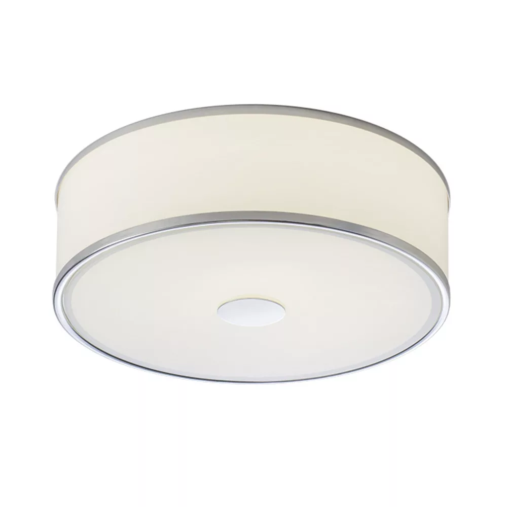 LED ceiling lamp. The lower part is covered with satin glass, which is fixed with a screw with a chrome cap. The sides of the lamp are made of frosted acrylic.
