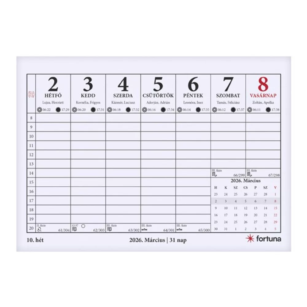 Desk calendar FORTUNA TA23 with stationary white flat moon phase 2026.