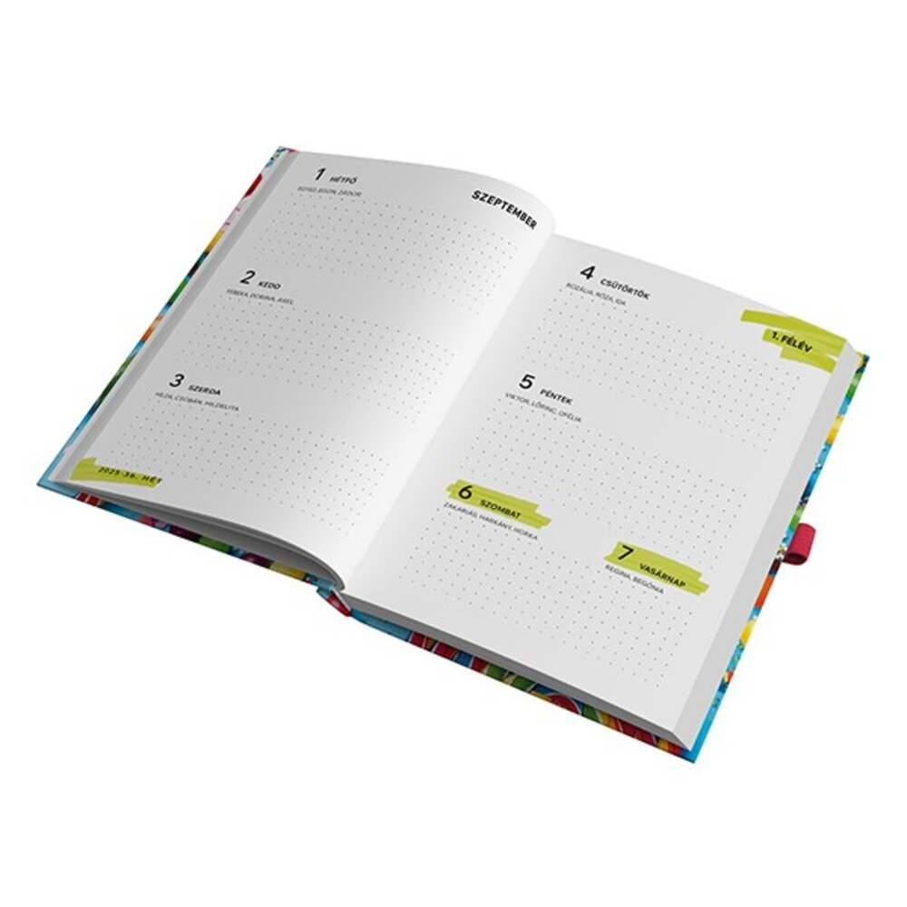 On 1 pair of pages, with 1 weekly schedule, colorful, foiled paper covers with different graphics, rubber pen holder with timetable, note pages, 60 pages of useful information related to each subject, with new interior / playing cards.