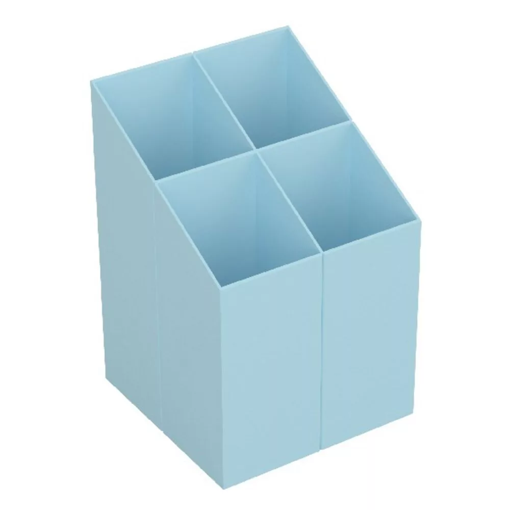 Design-designed, plastic body, six-compartment, tabletop notepad and stationery holder suitable for holding notepads of various sizes.