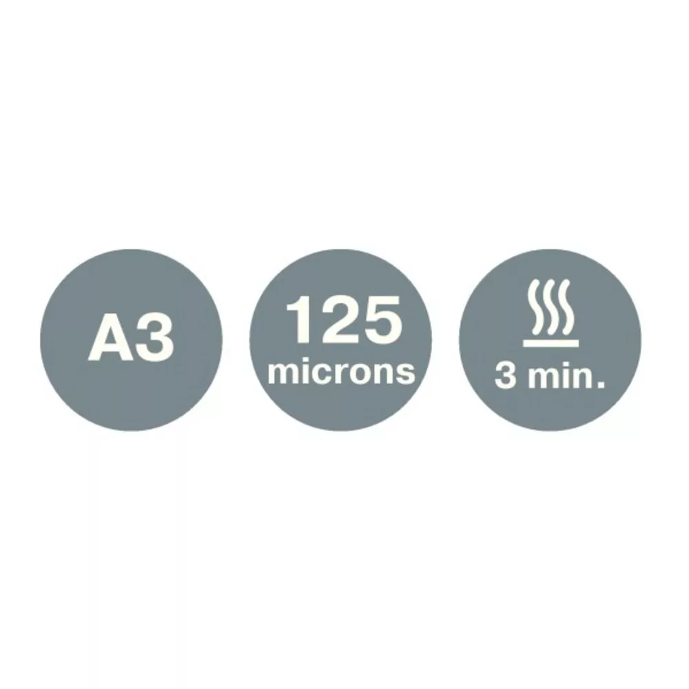 Stylish and compact A3 laminating machine. Only 3 minutes warm-up time. For 80-125 micron foils.