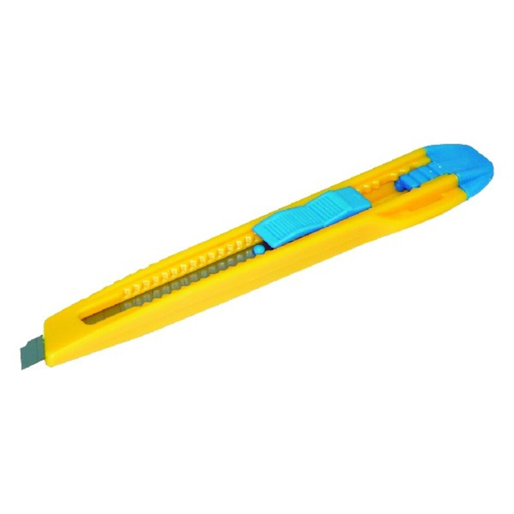 Safety knife with metal body, rubber grip, steel blades and foil cutter.