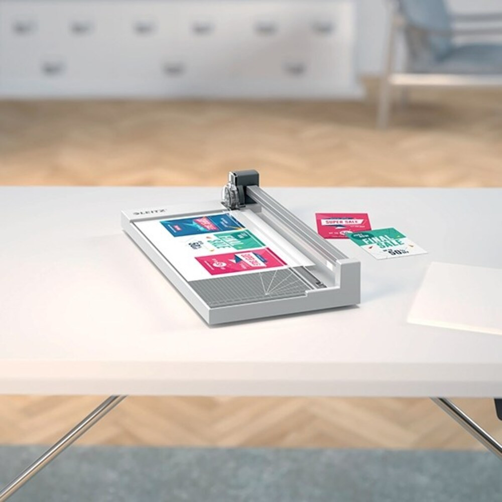 The Leitz Precision Office A3 roller paper cutter is perfect for everyday paper cutting tasks or creative work. This strong, yet versatile roller paper cutter easily, quickly and precisely cuts up to 15 sheets of A3 paper (80 g/m2) at a time and can be easily stored when not in use. Choose from straight, wavy or perforating cut blades, which, thanks to the transparent plastic case, ensure 100% safety and easy exchangeability. The cutting head ensures comfortable use, while the cutting edge guide, thanks to its transparent design, allows you to follow the cutting line for an accurate cut every time. The automatic paper fixing and clear size classification ensure accurate page alignment. The securely closed, polished steel rotary knife, the solid work surface and the extended 5-year warranty ensure long-term use.