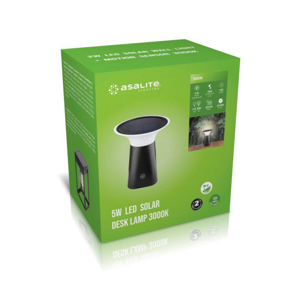 Az Asalite LED Szolár Asztali Lámpa 5W 3000K az 5W teljesítmény mellett 120 lumen fényerősség elérésére képes. A teret 120°-ban képes bevilágítani, így optimális választás lakókörnyezetünk (udvarok, teraszok, stb.) külterületeinek megvilágítására.