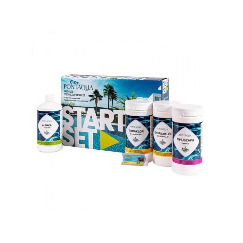 Essential chemicals for keeping your pool water clean. Contains: 1 kg of fast-dissolving chlorine granules, 1 kg of slow-dissolving chlorine tablets, 1.5 kg of pH-lowering chemical, 1 l of algae-inhibiting chemical, 1 AQUACHEK water analysis kit that measures the pH value and chlorine content of the water.