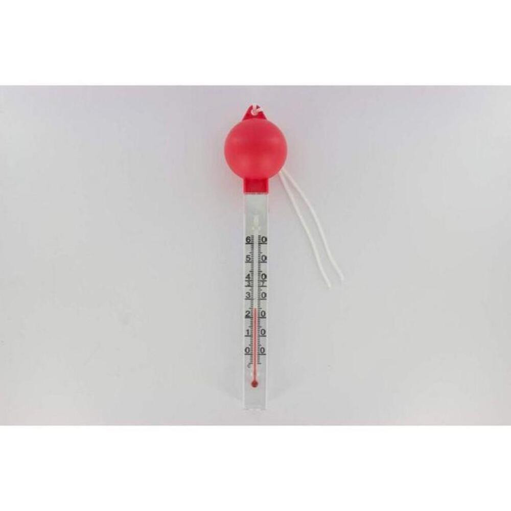 ball-shaped, red, floating water temperature gauge for swimming pools. The traditional design thermometer also features a °C/°F scale.