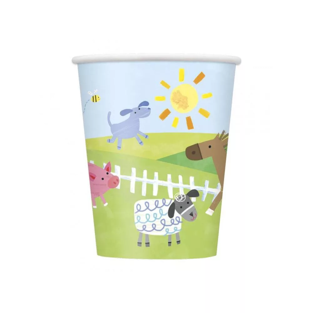 Paper cups are a practical addition to birthday parties.; The set contains 8 pieces.; Product classification: party products; Theme: farm; Packaging size: diameter: 8 x 14 cm; Material: paper; Product diameter, size: diameter: 8 x 9 cm, content 270 ml