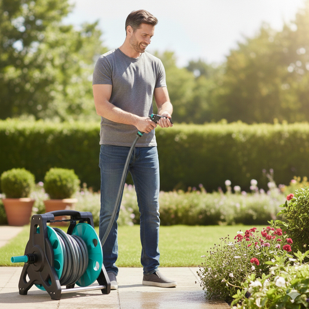 A hajtókarral működtetett kerti tömlődob rendszerezi a dolgokat, megkönnyíti a feltekerést, és megvédi a tömlőt a gubancolódástól és a töréstől.