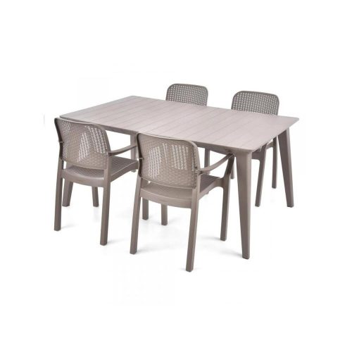 Négy székből és egy asztalból álló praktikus kerti bútor szett.; Nagyon tartós műanyagból készült. Nagyon könnyen karbantartható és tisztítható. Ellenáll a kedvezőtlen időjárási körülményeknek és az UV-sugárzásnak. Az asztal méretei: Szélesség 157 cm, mélység 98 cm, magasság 74 cm A fotel méretei: Szélesség 50 cm, mélység 59 cm, magasság 84 cm