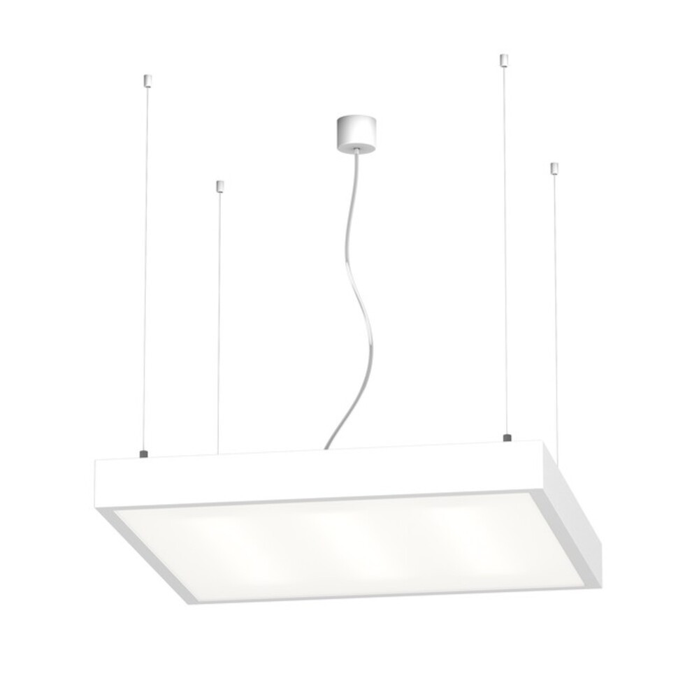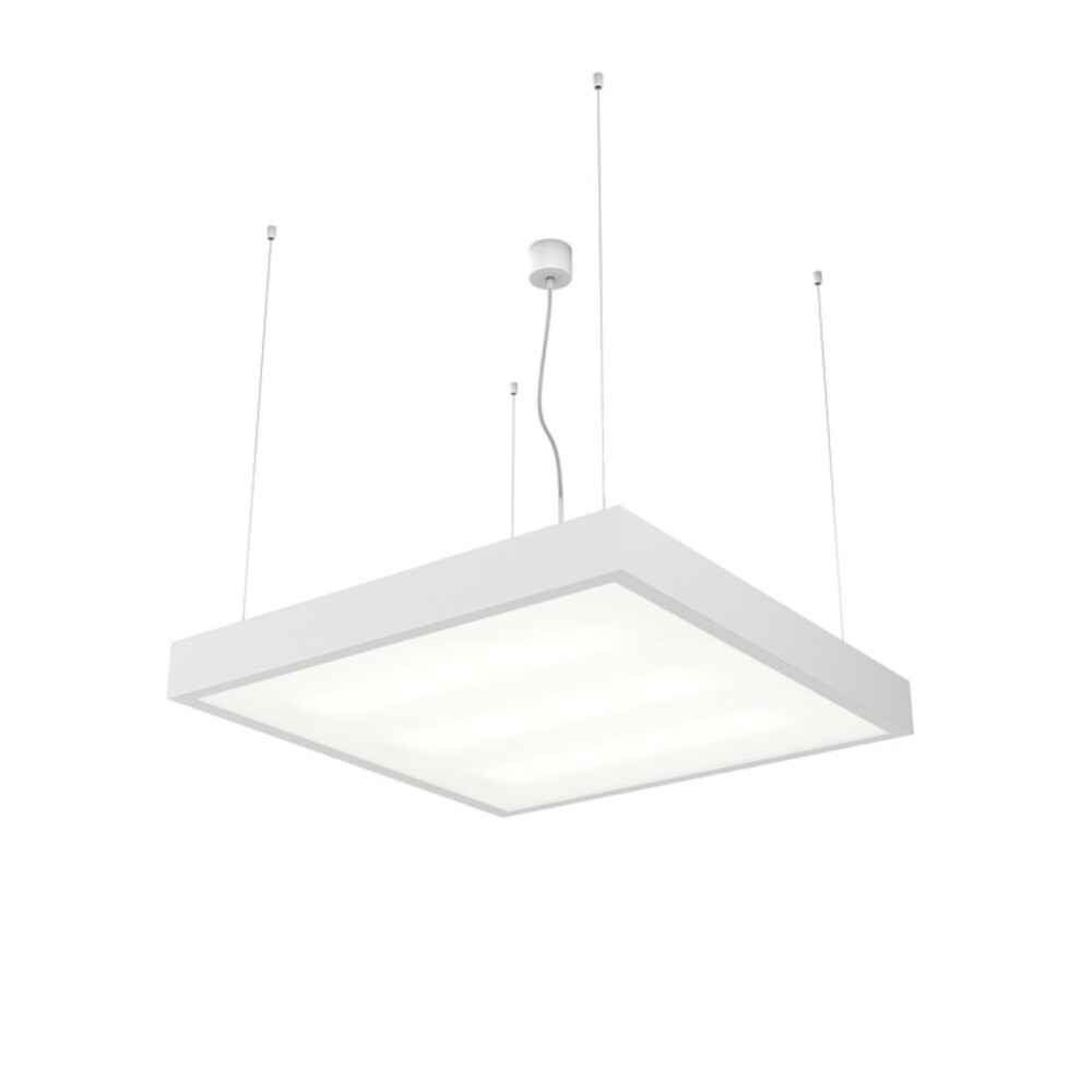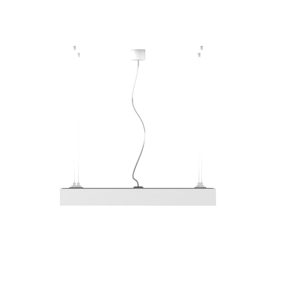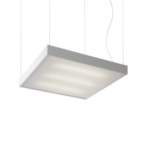 Square, aluminum profile fluorescent pendant lamp with an elegant design. Available in natural aluminum or white lacquered. With opal PMMA diffuser, downward lighting, three-core transparent cable.