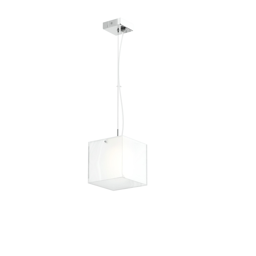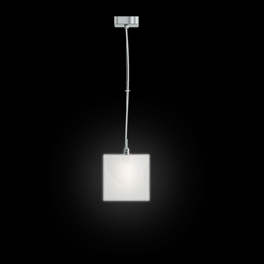 Pendant lamp with a square shade made of satin glass. The ceiling base and accessories are chrome-plated.