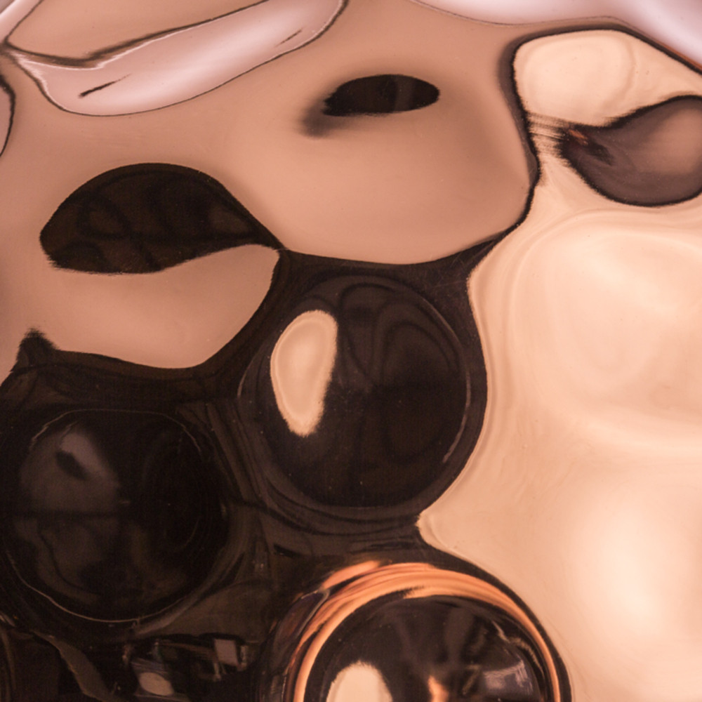 Pendant lamp with dented metal shade. The outside of the lampshade is copper, the inside is lacquered white. Comes with a black PVC cable and copper ceiling caps.