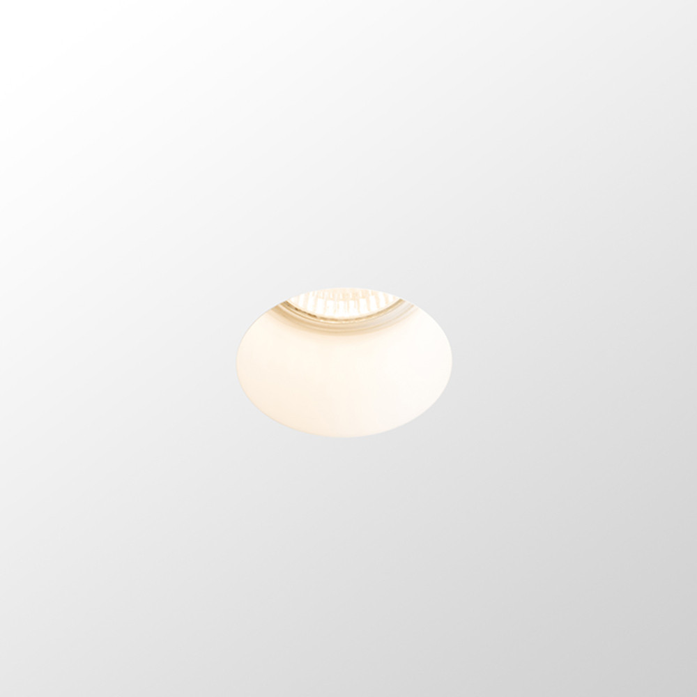 Frameless plaster lamp with a circular opening. The lamp can be painted over with indoor wall paints. Only suitable for installation in plasterboard.
