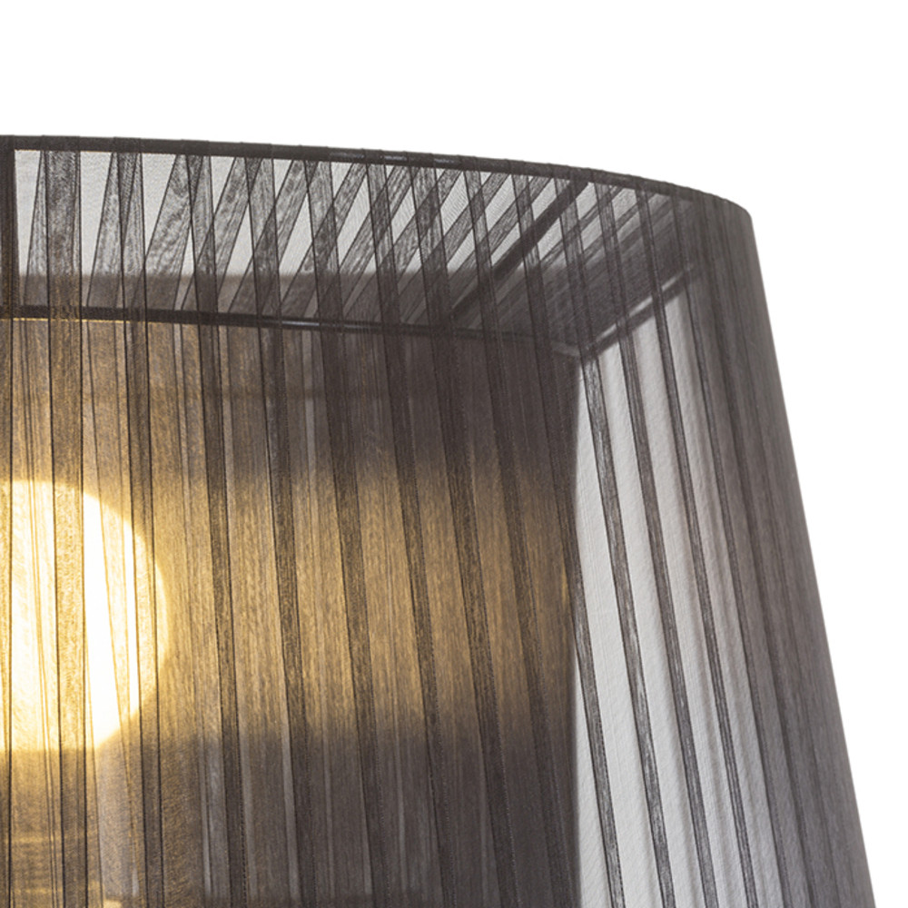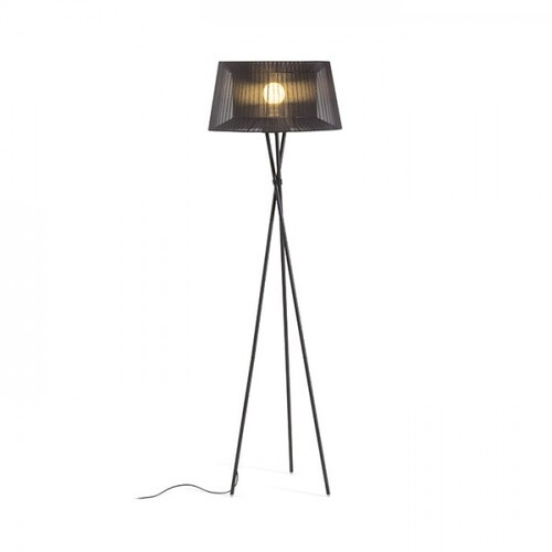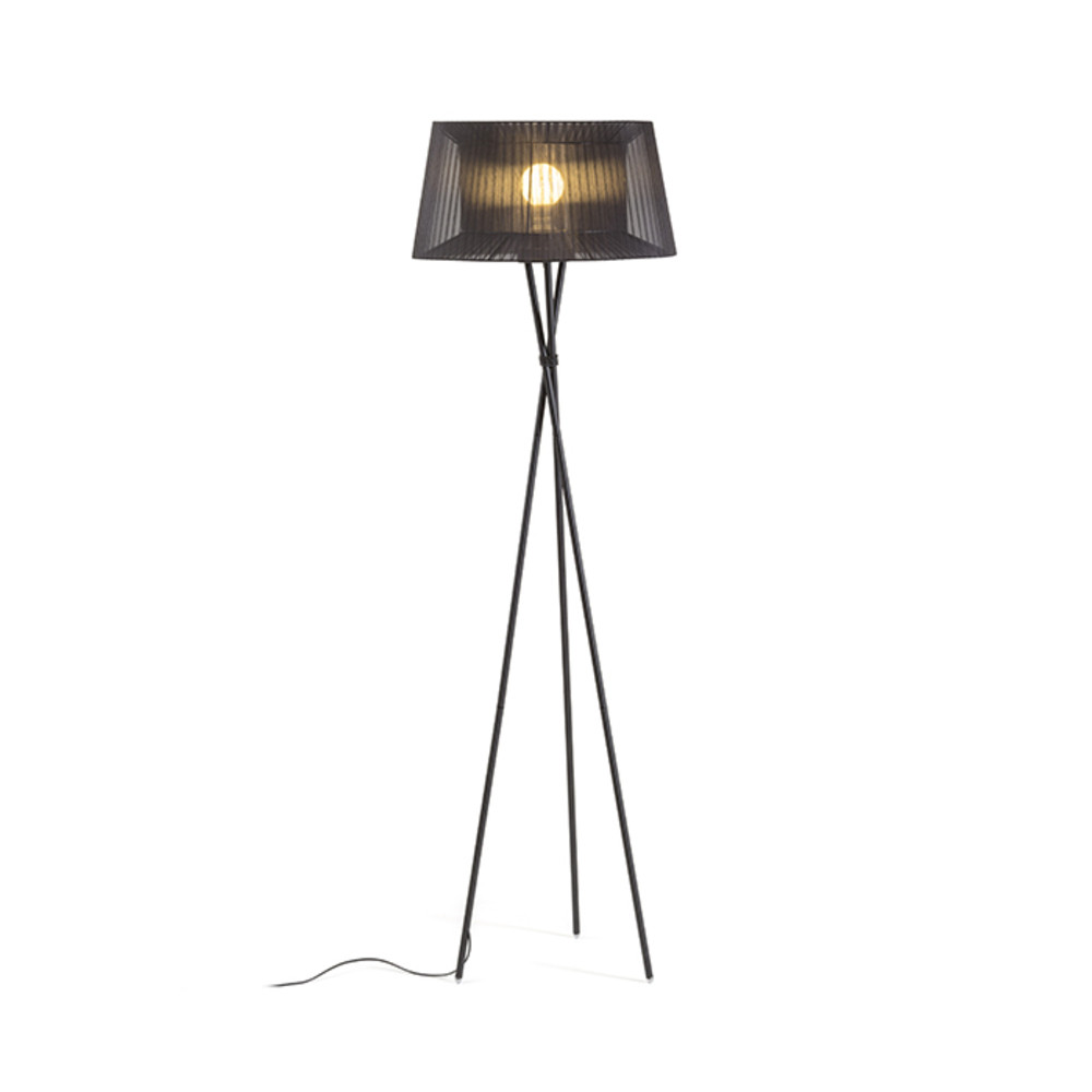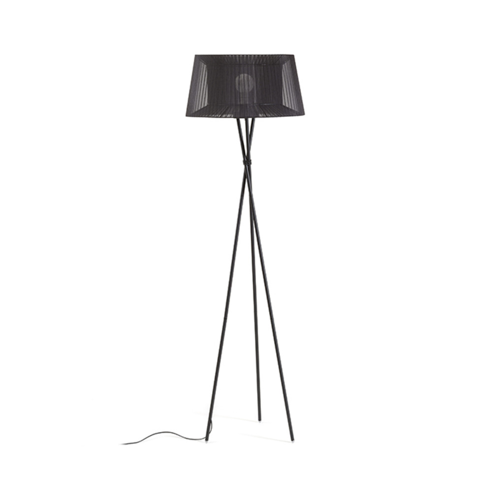 Floor lamp on a tripod stand with a double-ribbon lampshade in black.
