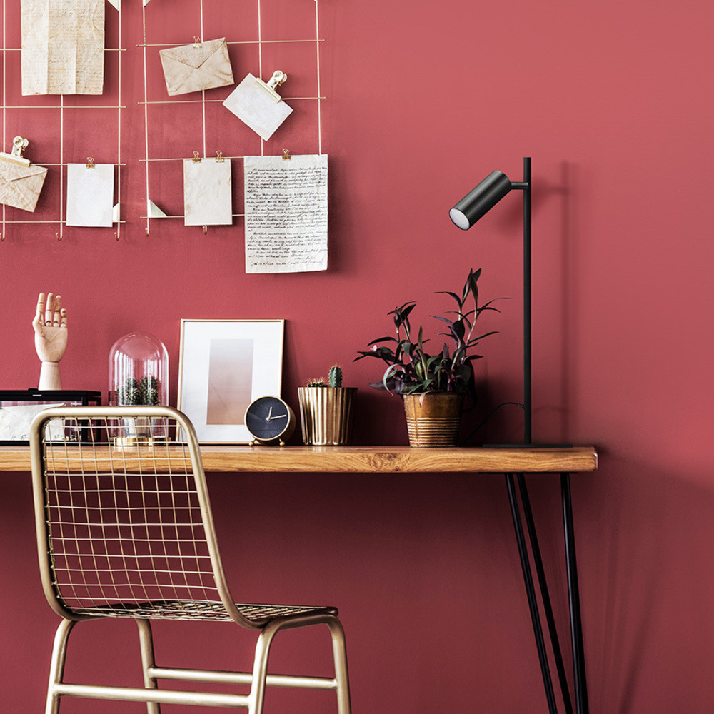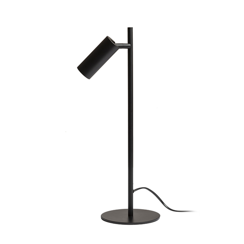 LED table lamp with a cylindrical reflector on a movable joint.