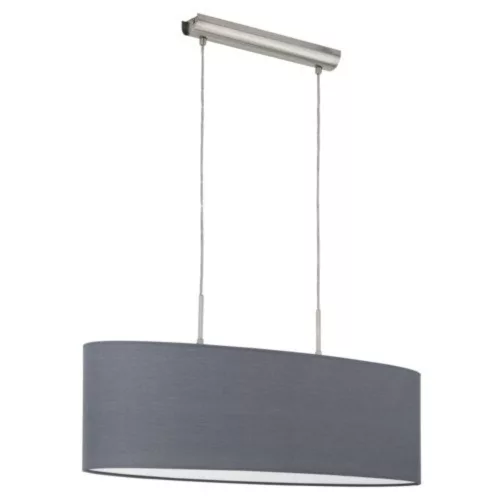The pendant lamp from the PASTERI series is made of matte nickel steel and gray textile. The product has protective insulation and operates with two E27 sockets. The light source is not included. The PASTERI family offers lamps made from steel and textile shades in various colors, shapes, and types. The lamp dimensions are: length 750 mm, width 220 mm, and height 1100 mm. The product has an IP20 rating, and the warranty is 2 years.