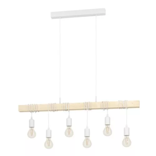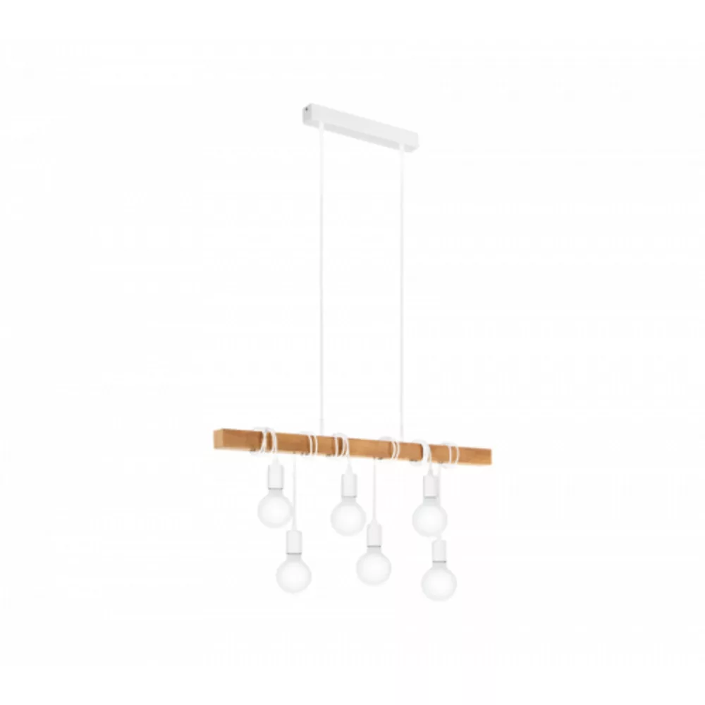 The TOWNSHEND suspension lamp is an elegant and vintage-style lighting fixture, featuring a wooden beam and six white lamp holders. The lamp holders are positioned at different heights and can be easily adjusted by winding or unwinding the cables. The harmonious combination of pine wood and metal allows it to perfectly fit into modern interiors, such as Scandinavian or vintage rooms. The lamp is excellent for providing light in any space, whether it's for a living room or above a dining table. It is important to note that the milky-white bulbs are not included with the product, and it requires E27 lamp holder bulbs. The unique design of the TOWNSHEND series creates an attractive vintage atmosphere in your home.
