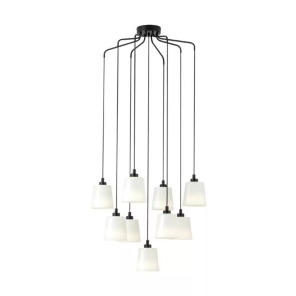 The BERNABETTA pendant becomes an eye-catching element in any interior with its special appearance and design. The lamp features nine shades made of white textile, enhanced by black metal details that add to its elegance. Its unique black hanging style provides mobility to the lamp, making it an ideal choice for above the living room or dining table. The product requires 9 x E27 light sources, which are not included in the package. Due to its design, the BERNABETTA is an excellent option for modern homes, adding a unique character to any space.