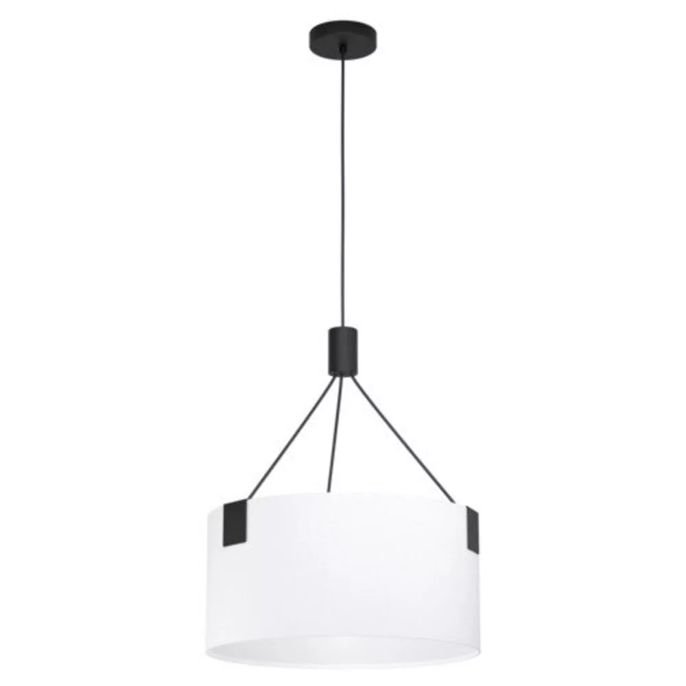 The TORTOLA pendant lamp features a clean, modern design that perfectly fits minimalist and contemporary interiors. The lamp has a circular white fabric shade combined with a black metal ceiling fixture and black textile cord, creating an industrial atmosphere accentuated by the three black metal profiles. It is an ideal solution for lighting a living room or dining room, especially above the dining table. The lamp includes E27 sockets, but the light source is not included. Its maximum power is 3x40W, providing sufficient light to create the right atmosphere.