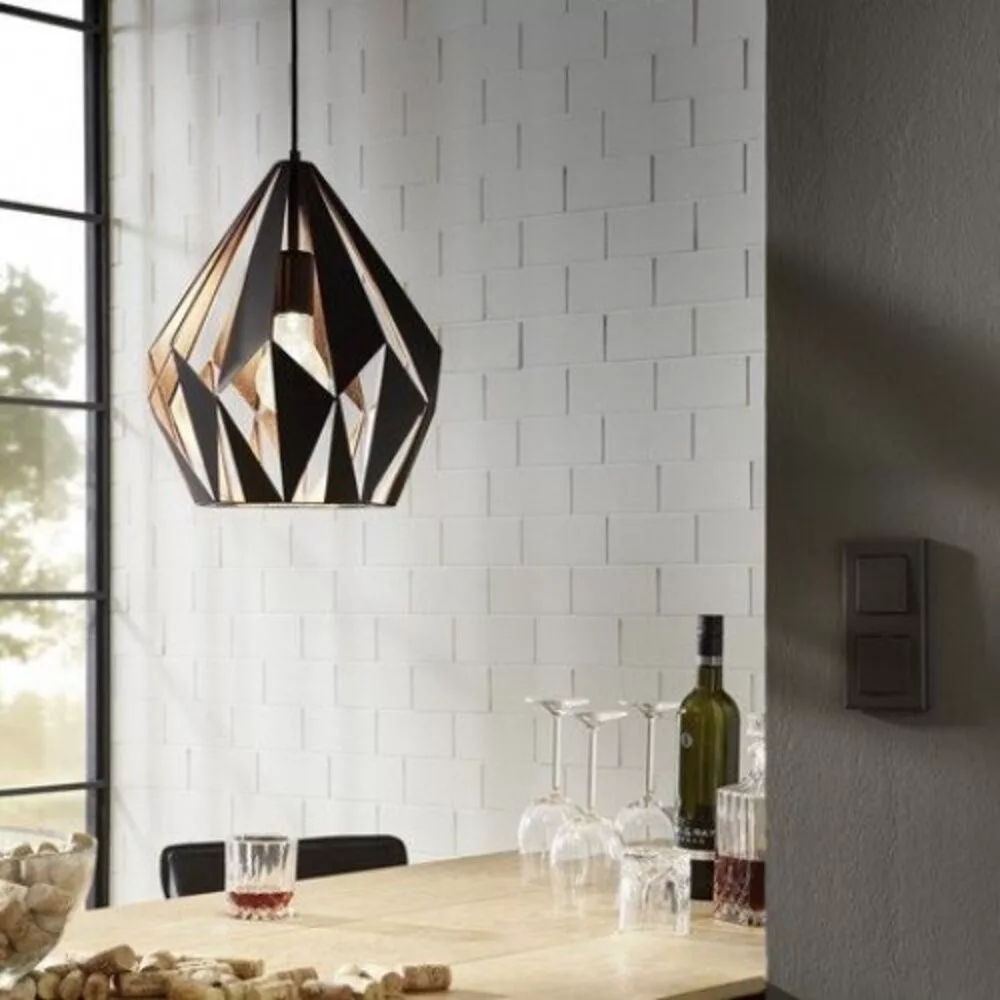 The CARLTON 4 table lamp features an elegant black metal base and a diamond-shaped black metal shade, which is lined with antiqued red copper on the inside. The geometric openings in the shade create a stunning play of light and shadow. The lamp can be easily turned on and off with the in-line switch. It fits modern interior design styles and is a perfect choice for the living room, bedroom, dining room, or hallway. The product requires 1 E27 light source, which is not included. The CARLTON 4 series lamps are available in various types, and their modern style adds a valuable and elegant look to any space.