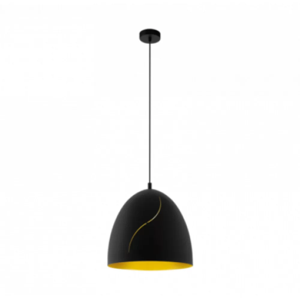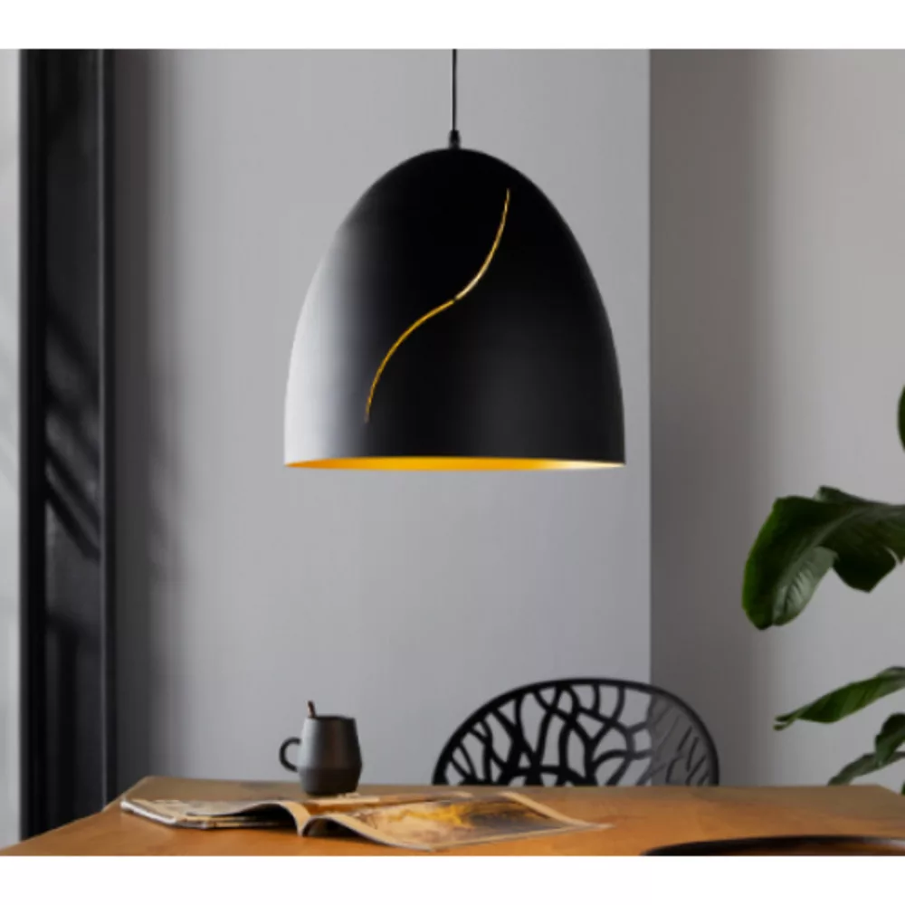The HUNNINGHAM pendant lamp creates a modern interior with its elegant appearance. The round black metal shade features a gold-colored inner lining, and the shade's curved cutouts evoke a stunning play of light and shadow. It is a perfect choice for a living room or above a dining table, beautifully illuminating the space. The product has an E27 socket, but the light source is not included. The black and gold color combination of the HUNNINGHAM product line fills the space with elegance and is available in various colors and sizes.