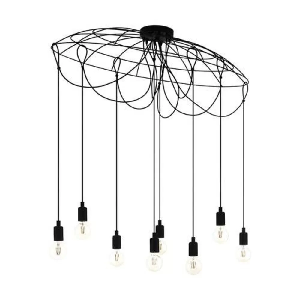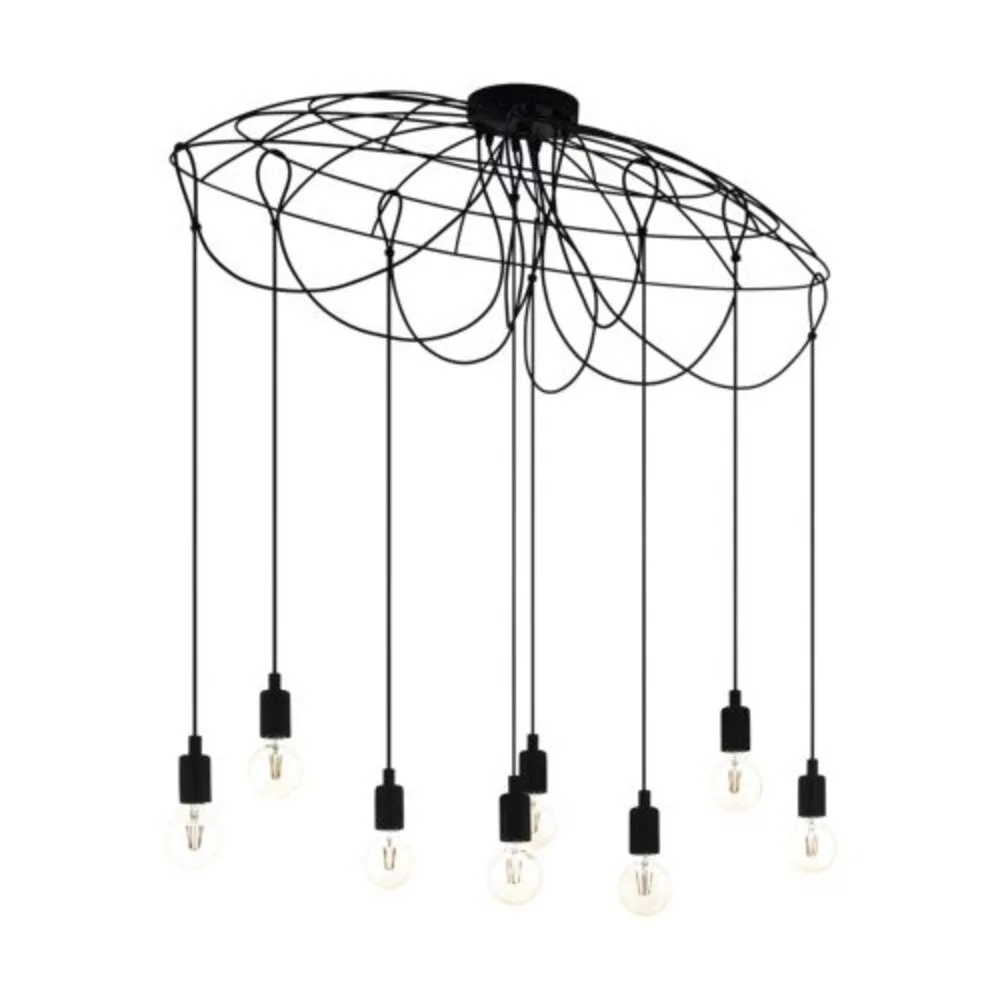 The HOGSMILL pendant lamp features unique oval wire shades from which eight black metal bulb sockets hang. The repositionable fixtures allow you to arrange the lamp sockets at varying heights, providing stylish layout options. The product can be combined with any bulb, making it well-suited to nearly any interior design trend. With a size exceeding 100 cm, it creates a special light source in any space, whether it's above a living room or dining table. The product requires 8 E27 bulbs, which are not included in the packaging. Its shade material is steel, and it is available in black. It is dimmable and operates without a switch. The maximum power is 8 x 40 W. The unique design and variable placement of the HOGSMILL pendant lamp create a distinctive atmosphere in your home.