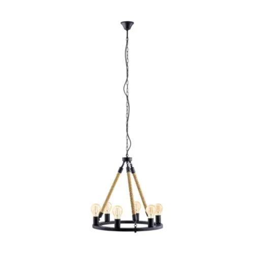 The FINDLAY pendant lamp features a black metal ring that holds six black light sources. The ring design hangs from hemp rope and black metal elements, making it a perfect fit for the lamp's vintage style. With its rustic chandelier appearance, the pendant can be an eye-catching feature in the living room or above the dining table. The bulbs shown in the picture are not included with the product. The lamp has an E27 socket and requires 6 x E27 light sources.