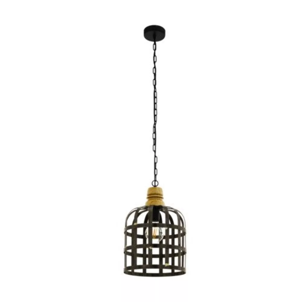 The OLDCASTLE pendant lamp features a round shade suspended in a black-brown metal frame, hanging from a black chain. The shade has delicate gold-colored details and a natural rustic wood accent. Thanks to its geometric design, the metal strips create a stunning interplay of light and shadows when the lamp is turned on. The pendant is ideal for setting the mood in the living room or above the dining table. The light source is not included, and the product has an E27 socket, requiring an E27 light source. The OLDCASTLE lamp series stands out with its stylish design compared to classic models and is available in two different versions.