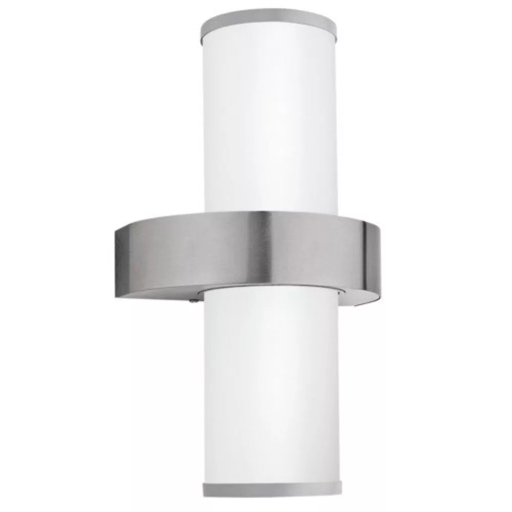 The BEVERLY outdoor wall lamp, with its classic and elegant appearance, perfectly fits into any modern outdoor environment. The lamp features a stainless steel frame and white, satin-finished glass cylinders located at the top and bottom of the lamp. With an IP44 rating, it is resistant to splashes of water, ensuring it is suitable for outdoor use. The lamp has two E27 sockets with a maximum power of 2x60W, but the light source is not included with the product. Product dimensions: 200 mm long, 350 mm wide, and 135 mm projection. A 2-year warranty ensures quality and reliability.