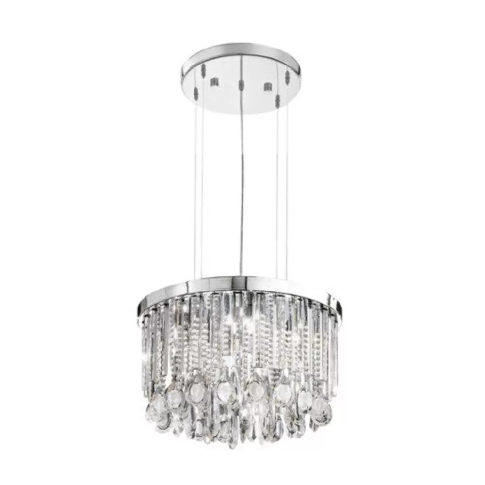 The CALAONDA series stunning pendant lamp enchants your home with its unique play of crystal and light. The freely hanging crystals in various shapes serve as true eye-catching elements everywhere. The elegant stainless steel casing dazzles in chrome color, while the transparent crystal shade provides special light effects. The lamp includes G9 ECO type light sources, so it is ready to use immediately. This dimmable lamp is not only beautiful but also functional, as it can be installed without cables and plugs. The IP20 protection rating and the Class 1 touch protection confirm that the CALAONDA series is an innovative and safe choice for indoor lighting. Product dimensions: 1100 mm long, 500 mm in diameter, and the maximum height is adjustable. The EGLO brand lamp has a gross weight of 13.62 kg, and the packaging type is unique. The light source is included with the product.