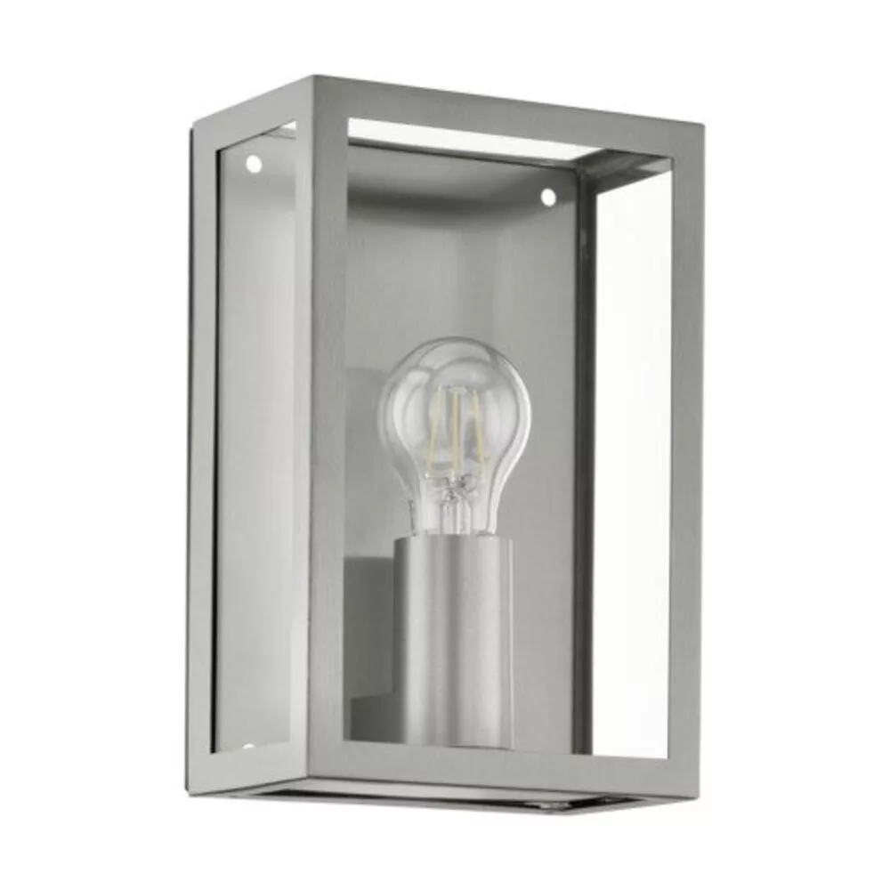 The ALAMONTE 1 outdoor wall lamp features an elegant stainless steel frame and a transparent glass panel, where the light source is located. Thanks to its IP44 protection rating, it is protected against splashes of rainwater, making it an ideal choice for modern outdoor areas. The product has an E27 socket and requires 1 E27 light source, which is not included with the product.