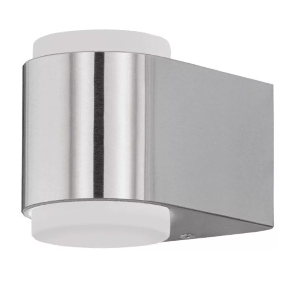 The BRIONES outdoor LED wall lamp features a modern, rounded aluminum die-cast body treated with stainless steel finish. The circular white plastic covers placed on the top and bottom of the lamp provide a pleasant warm white light, thanks to the integrated LEDs. With an IP44 rating, the device is suitable for outdoor use and is resistant to splashing water. Its discreet design allows it to easily fit into any modern outdoor space. The light source is included with the product. The lamps in the BRIONES product family offer harmonious light accents for outdoor areas with their modern appearance.