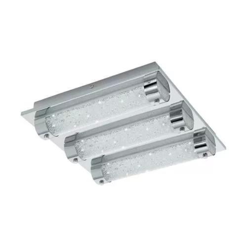 The TOLORICO LED ceiling lamp features an elegant square stainless steel cover in chrome color, and includes three transparent plastic tubes. The integrated LEDs emit a neutral white light, creating a sparkling effect when projected onto the crystal beads inside the tubes. This product has an IP44 rating, making it suitable for bathroom use. The lamp dimensions are 35 x 35 cm, making it a perfect fit for modern interiors, providing stylish lighting for the bathroom, kitchen, or hallway. The TOLORICO product line offers sophisticated LED lamps in tubular style, which are universally applicable and boast a stunning appearance. The light source is included with the product.
