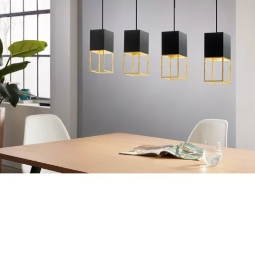The MONTEBALDO pendant is a stylish, modern solution that is perfect for above the living room or dining table. The long black metal bracket is adorned with four cube-shaped lamp heads featuring gold-colored metal frames, highlighting the lamp's elegance. The GU10 bulbs placed inside the fixtures remain hidden, providing a pleasant, warm white light for the space. The product includes the light source, so it is ready to use immediately. The MONTEBALDO series offers various lamps that perfectly complement modern interiors.