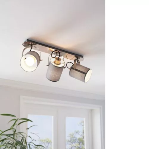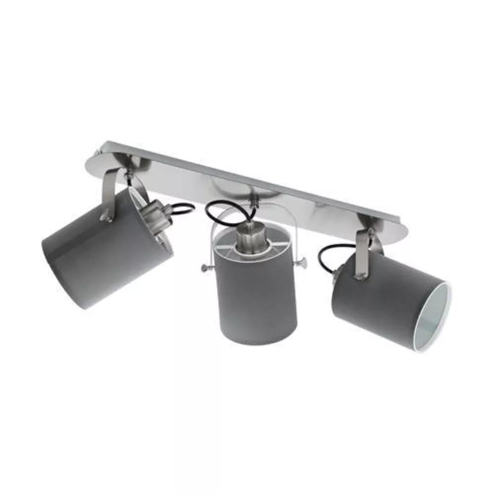 The VILLABATE wall or ceiling spotlight is made of metal with a matte nickel finish and features three adjustable gray textile spotlights. Its design fits modern interior styles. With its rotating heads, this minimalist ceiling lamp works well in any space, whether it's a kitchen, living room, bedroom, hallway, or dining room. The light source is not included, and it is equipped with E27 lamp holders, so it requires E27 bulbs. The VILLABATE spotlight series is not only impressive with its simple and clean design but also with its vintage-style textile shades.