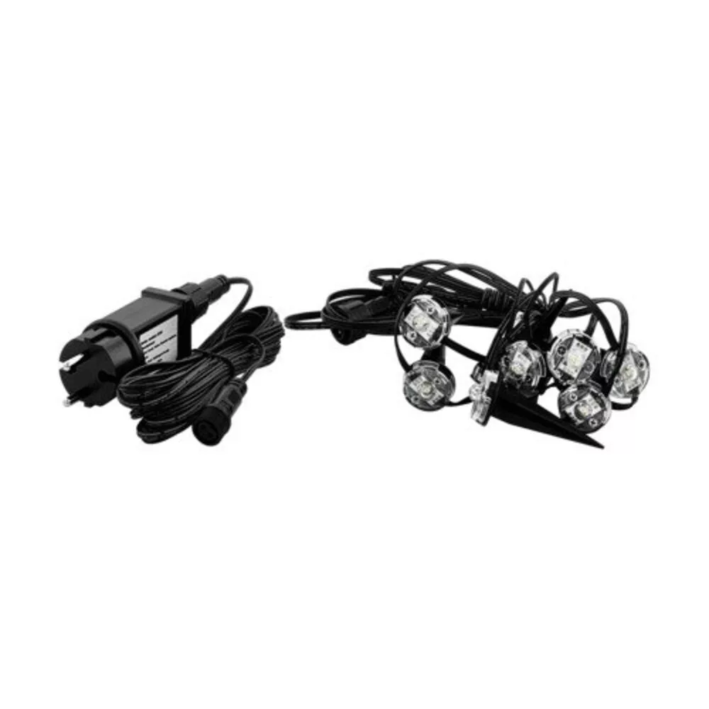 The SPINETOLI LED garden lamp is a special outdoor lighting solution featuring nine round, transparent plastic heads connected by a black plastic cable. The lamps can be secured with ground stakes and emit a pleasant warm white light thanks to the integrated LEDs. With IP65 protection, the product is suitable for outdoor use, protected against dust and low-pressure water jets. It is an ideal choice for decorative low-level lighting in flower beds. The lamps are connected via a plug on the cable. It is important to mention that the light source is included with the product, making it ready for immediate use. The SPINETOLI product line's light chain allows for individual placement of lamp points, which can be installed not only by planting in the ground but also on solid surfaces.
