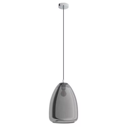 The ALOBRASE pendant lamp features a modern, rounded design with a black smoked glass shade. The lamp hangs from a circular chrome-colored metal ceiling plate with a black cable. With a diameter of 30 cm, it fits perfectly into any modern interior. This trendy pendant provides stylish lighting for your living space, whether it's in the living room or above the dining table. The filament bulb shown in the picture is not included with the product. Thanks to the E27 socket, you can easily choose a suitable light source for it.