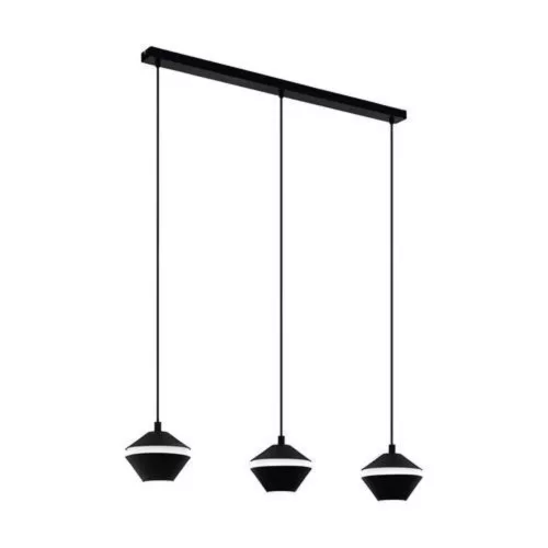 The PERPIGO LED pendant lamp is made of black metal and features three trapezoidal lanterns. The product includes an LED light source that emits a pleasant, warm white light to the area below. The white light elements in the center provide indirect lighting, creating a unique and eye-catching characteristic. The simple design of the pendant fits well with modern interiors, providing stylish lighting in any space, whether it's a living room or above a long dining table.