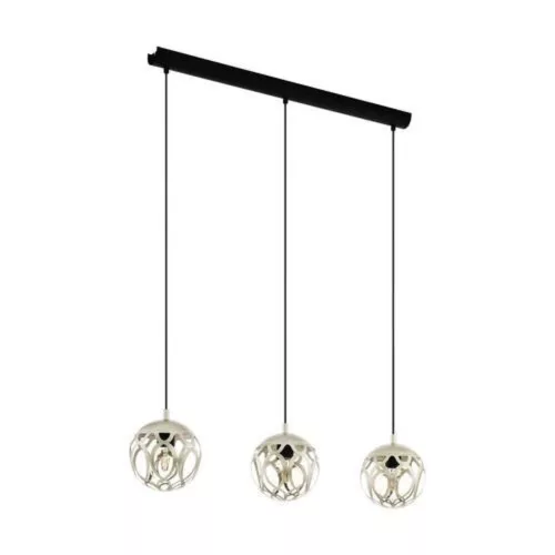 The MIRTAZZA pendant lamp features a black metal surface and three champagne-colored spherical shades. The organically shaped cutouts create a stunning play of light and shadow when the lamp is switched on. With its special design, it offers a unique lighting solution for any space, whether in the kitchen, living room, or above a long dining table. The filament light sources shown in the picture are not included with the product. The lamp has an E27 socket and requires E27 bulbs. The maximum power is 3x60W.