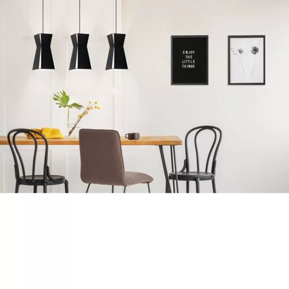The VALECROSIA pendant lamp, with its modern and stylish appearance, is a perfect choice for any interior space. The lamp features three shades, each made up of four black metal plates with a white inner surface. The cut design of the shades gives it a unique look and creates a stunning play of light and shadow on the wall. It is an ideal solution for living rooms or above a long dining table. The product has an E27 socket, but does not include a light source. Its maximum power is 3x40W, allowing for various lighting options. The lamp arrives without a cable and plug, and it is not dimmable. The size of the ceiling cover element is 830 mm x 50 mm x 25 mm, so it fits easily into most interiors. The VALECROSIA pendant lamp is the perfect choice for lovers of modern design.