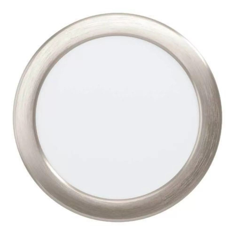 A FUEVA 5 recessed LED lamp is made of brushed nickel-coated steel, with a diameter of 166 mm and a height of only 26 mm. This lamp is the perfect choice for any living space, as it can be installed in insulating material. The integrated LED light sources are covered with a white diffuser and emit neutral white light. A 155 mm diameter hole is required for installation. The recessed spotlight's classic design and neutral white surface lighting are ideal for kitchens, hallways, pantries, or offices where good illumination is needed. The product includes the light source required for illumination, with a maximum power of 11W. It is dimmable, has an IP20 protection rating, and comes with a 5-year warranty.