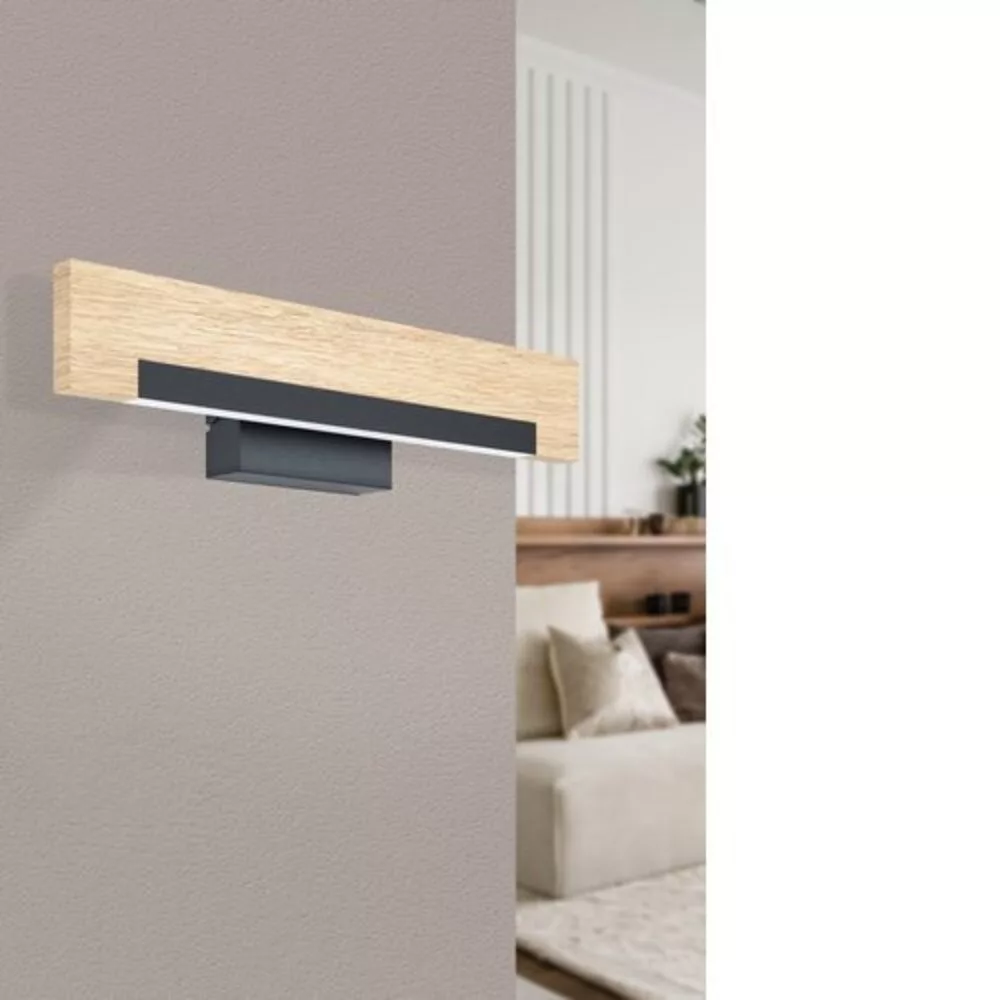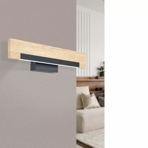 The CAMACHO LED wall lamp combines a stylish black metal frame with natural oak veneer and a black LED profile. The integrated LED light source provides a pleasant warm white light. This wall lamp fits into any interior space, creating a unique and eye-catching element in the living room, bedroom, hallway, or dining room. The light source is included with the product, so it can be used immediately.
