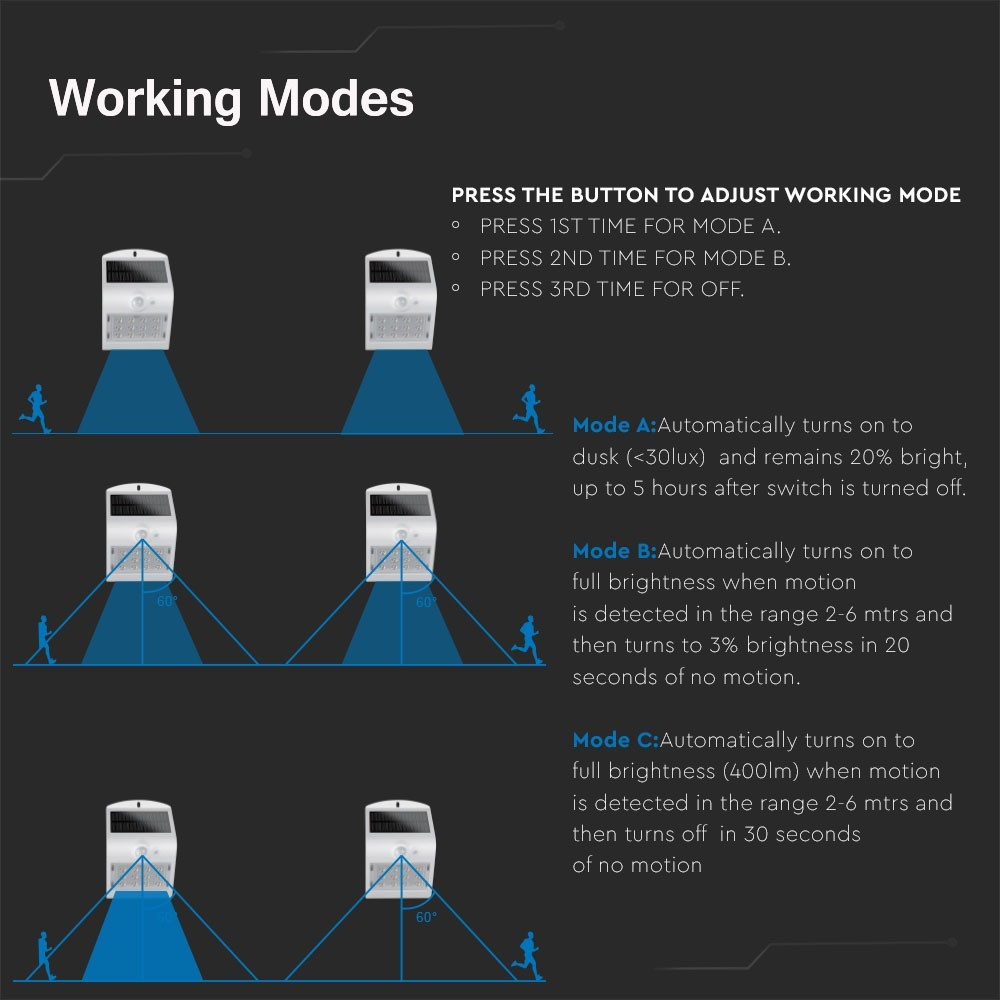 Bring light to your garden! The solar lamp is an excellent energy-saving solution for the garden. Modern outdoor lamp with built-in solar panel and sensor. We have the option of setting 3 different modes: Mode 1: Automatically turns on at dusk and at 20% brightness. (5 hours of operation) Mode 2: Automatically turns on at full brightness when motion is detected, then reduces its brightness to 3% if no further motion is detected within 20 seconds (operating time 2-3 nights) Mode 3: Automatically turns on at full brightness when motion is detected, then turns off if no motion is detected in the next 30 seconds Detection distance: 2-6 meters Applicable: for lighting the external traffic areas of family houses, other buildings, back gardens, pool terraces.