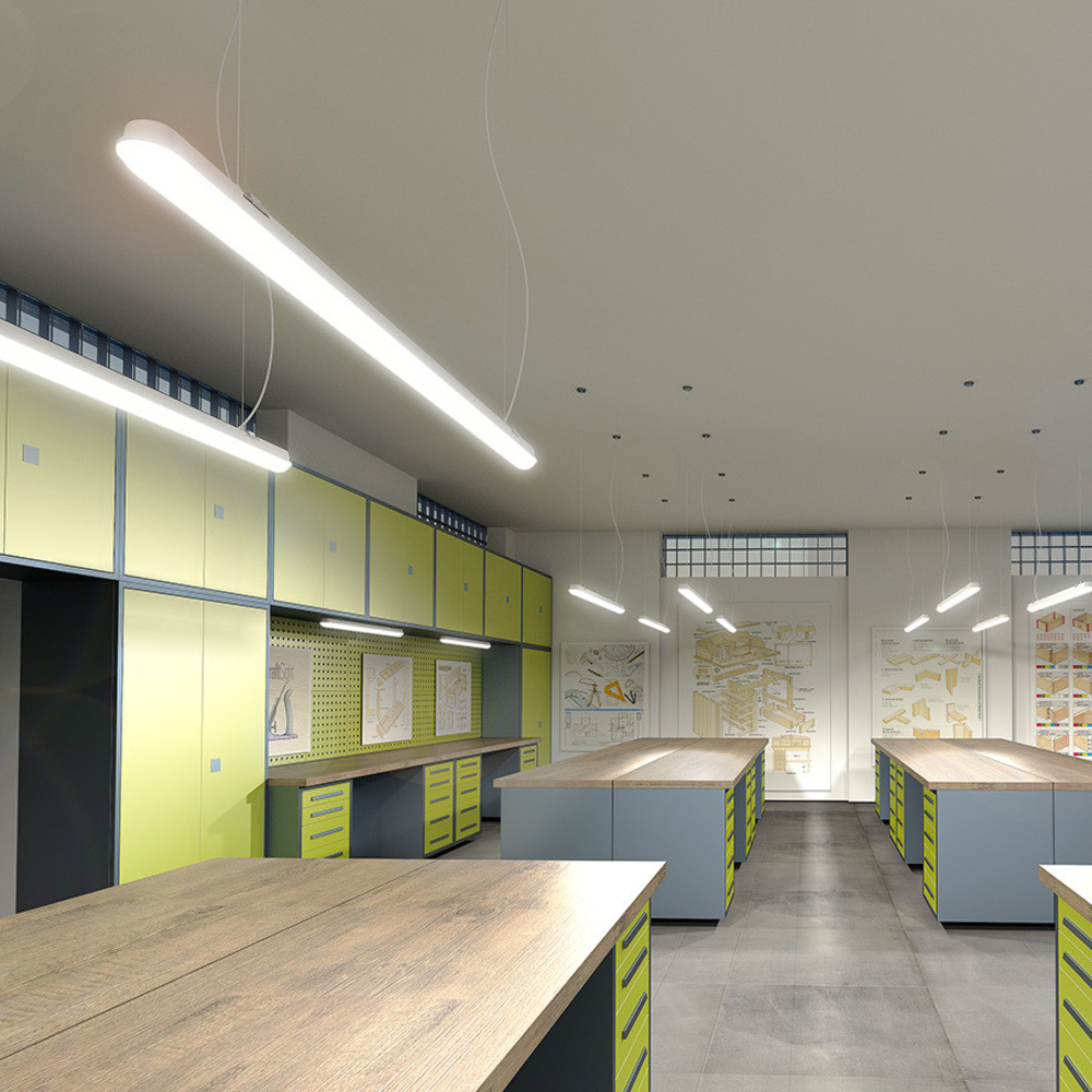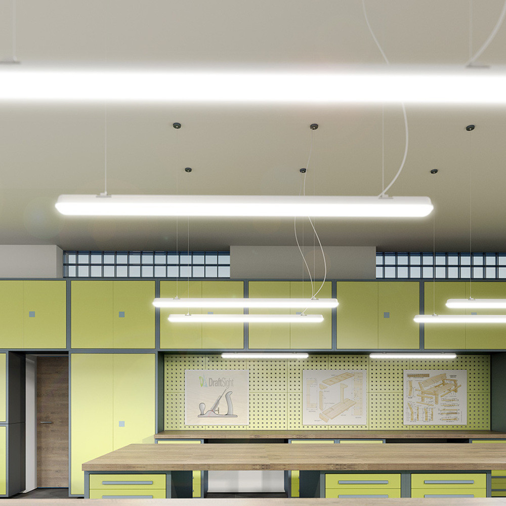 Industrial linear LED light for ceiling mounting or suspension using the G13672 kit. High power and IP65 protection. Supplied without suspension kit and power cable. Possibility to connect the lights in series.