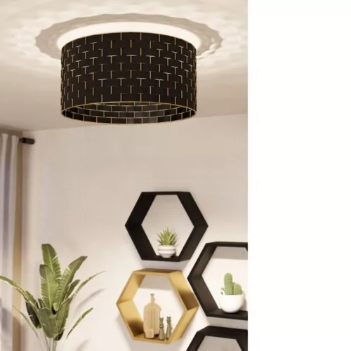 The MARASALES ceiling lamp, with its elegant design and sophisticated '60s appearance, fits into any interior space. The round wire cover is crafted in brushed brass color, interspersed with black textile strips, providing a pleasant light for the living room, dining room, or bedroom. The product does not include a light source; it requires 1 E27 socket with a maximum power of 1X40W. The lamp creates a cozy atmosphere in any room when combined with various styles.