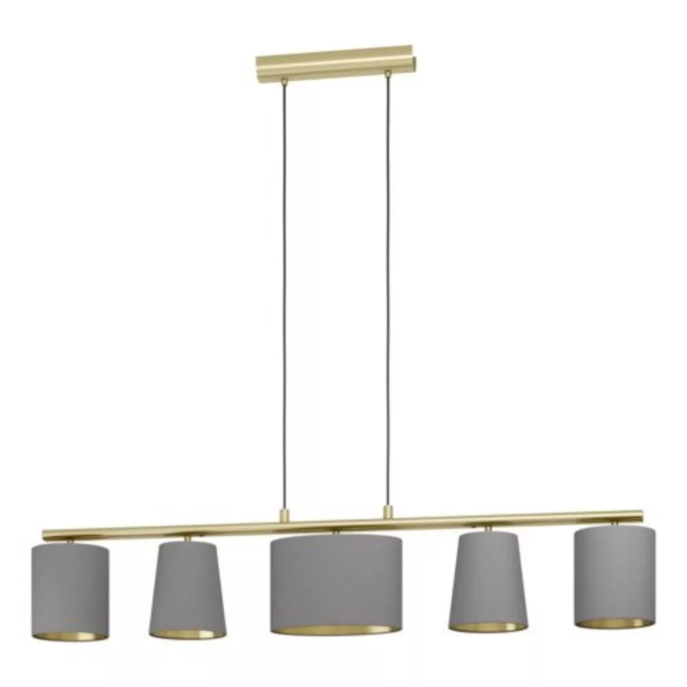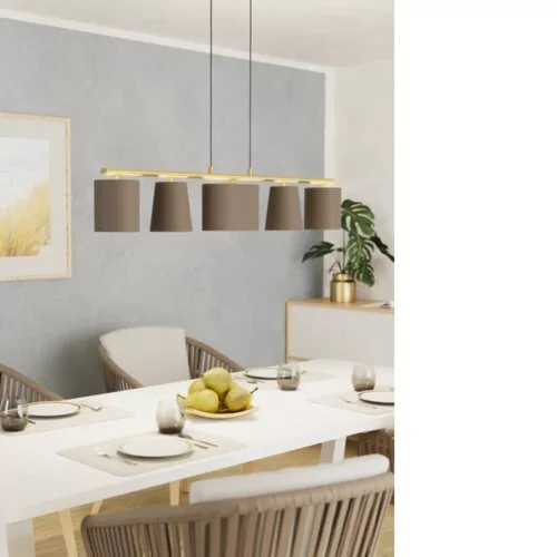 The ALMEIDA 2 ceiling lamp offers an elegant light source for modern interiors. The light sources are not included with the product. The metal base is made of brushed brass, featuring a long metal arm that is also the same color. The three cappuccino-colored textile shades have a brushed brass interior, providing an attractive appearance, while the conical and oval shapes enhance the aesthetic experience. The retro-chic design reminiscent of the 60s fits perfectly in modern apartments, creating a pleasant lighting atmosphere in the living room, bedroom, dining room, or hallway. The lamp requires 5 E27 base light sources, which are not included in the package.