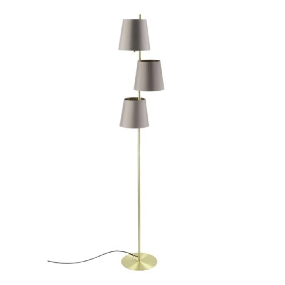The ALMEIDA 2 floor lamp features an elegant brushed brass metal base, complemented by three cappuccino-colored conical fabric shades. The inner side of the shades is also brushed brass, giving the lamp a unique appearance. The lamp can be easily turned on and off using the foot switch. Inspired by the 1960s retro-chic style, it fits perfectly into modern interiors while providing a pleasant light in the bedroom, living room, dining area, or hallway. The product requires 3 E27 bulbs, which are not included.