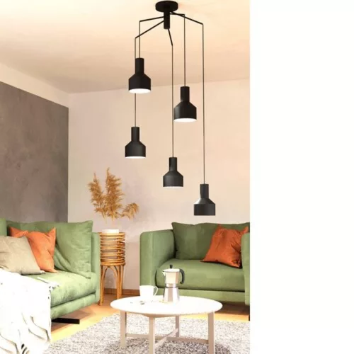 The CASBIARE suspension lamp consists of five black metal lamps and a black metal mounting element. This special mounting shape and monochrome design resemble a mobile, making it a striking vase in your home. The product has an E27 socket and requires 5 E27 light sources, which are not included in the package. Create a unique atmosphere in any interior with this elegant lamp!